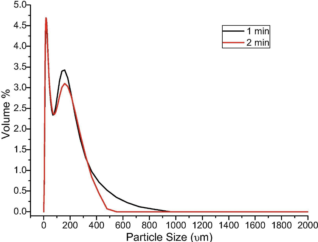 All ingredients of the coating formulations were grinded for two different times (one and two minutes) to study the effects of particle size on the coating performance. The particle size distribution was performed using particle size analyser and results are illustrated in Fig. 2. Ten formulations of IFRCs were developed and their composition is given in Table 2. Precisely weighed quantity of coating ingredients were blended by a shear mixer at 20 rpm. The blended mixture of ingredients was dispersed in epoxy resin for 30 mins and during the last 15 min, hardener was incorporated in the blend to evade cross-linking of epoxy with hardener. The developed IFRC was used on sandblasted steel substrate in size of 100 x 100 x 1.5 mm using a brush. The coating was allowed to cure for one week at room temperature to ensure complete hardened coating. The procedure was adopted to develop all coating formulations studied.