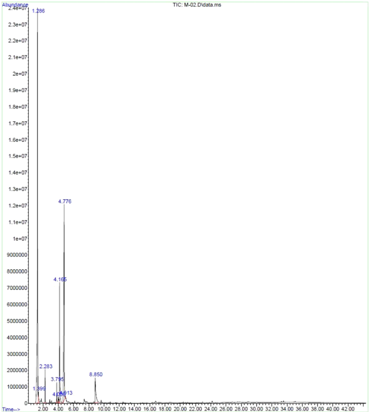 IF5-2 was selected to be examined with Py-GCMS. The results showed 9 peaks as given in Table 7 and the chromatogram was demonstrated in Fig. 25. The 4%weight of wollastonite and bentonite (1:1) reduce the emission of the phenol 12.85% at 4.165tR, which is 54.31% less than observed for IF1-2. Nine gaseous products were noted during the GC-MS test which are less than the control formulation IF2-1. The main gaseous products were obtained from the thermal disintegration of IF5-2 were 1-Octadecanamine, Phenol, Benzyl Alcohol, and 1,3-Cyclopentadiene as the chromatogram was illustrated in Fig. 25. The addition of inorganic fillers wollastonite and bentonite (1:1) facilitated to minimize the emission of gaseous compounds to create dense and spongy char which sheltered the underlying steel substrate throughout fire of intumescent coating.