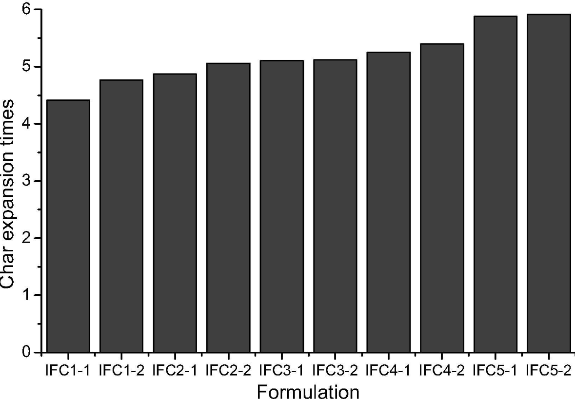 This research investigates the synthesis of new formulations of intumescent coating with improved thermal performance for steel structures. The coating formulations were based on the expandable graphite reinforced with wollastonite and bentonite. Ten samples of five formulations were synthesized by varying grinding time duration between 1 and 2 min. To analyse the substrate temperature of coated steel, fire test was performed according to ASTM-E119. The char morphology was observed by Field Emission Scanning Electron (FESEM) and Transmission Electron Microscopy (TEM). FTIR and X-ray Diffraction (XRD) test is conducted to analyse the composition of the residual char. The residual char mass was perceived by Thermogravimetric analysis (TGA) of the coating. X-ray Photo Electron Spectroscopy (XPS) was utilized for binding energy and elemental composition of the char. One-hour fire protection test showed 166 °C, the lowest substrate temperature of IFRC5-2 and 40.46% residual mass was obtained by TGA analysis. XRD analysis showed that residual char has aluminum borate and borophosphate and confirmed by functional group analysis using and FTIR. FESEM and TEM illustrated that char relates to hexagonal particles of wollastonite. XPS analysis of IFRC5-2 showed the carbon and oxygen contents were 41.40% and 51.20%. Pyrolysis-Gas Chromatography-Mass Spectrometry (Pyrolysis GC-MS) results showed IFRC-5 produced less concentration of the gaseous products compared to IFRC-C. The formulations developed by grinding solid ingredients for 2 min showed improved thermal performance compared with the formulation produced by grinding solid ingredients for 1 min. Longer grinding time and higher amount of filler improved the thermal properties of the intumescent coating.