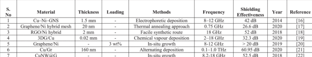 This study reviewed existing research on electromagnetic interference (EMI) shielding using graphene, copper, and nickel-based composites. It concluded that these materials, particularly in combination, show significant promise for effective EMI shielding in the X-band and higher frequency ranges. Various studies demonstrated that composites such as copper and graphene, nickel and graphene, and their hybrids could achieve shielding effectiveness of up to 60.95 dB in the terahertz frequency range. The study highlighted that copper, due to its superior electrical conductivity, is particularly effective when combined with graphene for EMI shielding applications.