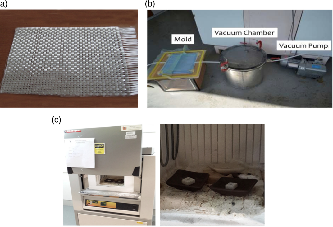 E-glass was purchased from Castmech Technologies Sdn Bhd, Ipoh, Malaysia. It has a fiber diameter of 24 °m, 380 + 40 g/m2 of mass per unit area, 750 yarns per meter with 1.2 kg/m linear density, and fiber density of 2550 kg/m3. Epicote 2820 was supplied by Wee Tee Tong Chemical Sdn. Bhd, Johore, Malaysia, and used as a matrix in the fabrication process. Epicote 2820 consists of two parts: part A, the epoxy, and part B, the hardener. The vacuum infusion molding (VIM) technique was used to fabricate the composites.23 The E-glass and VIM fabrication process is given in Figure 1(a) and (b), respectively. Three GFRP plates were fabricated for each of three different thicknesses with a dimension of 35 cm x 35 cm and thickness of 3 mm, 5 mm, and 7 mm, respectively. The stacked of fiber clothes used in this study were 5 plies of woven glass fiber to produce 3 mm thick composite laminate test samples, 8 plies of woven glass fiber for the 5 mm thick composite laminate test samples, and 11 plies of woven glass fiber were used for the 7 mm thick composite laminate. It was ensured that the vacuum pressure used in the manufacturing process was set to 90 kPa and a motor power of 0.37 kW. The fabrication of the composites was done at room temperature. The impregnation process lasted 10, 12, and 15 min for the 3, 5, and 7 mm thick GFRP composites, respectively. Post-curing of the composites was done for 2 h at 90° in the oven.