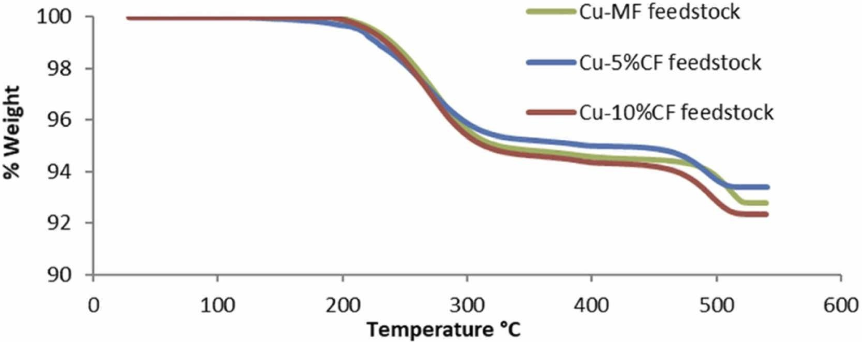 The results from thermogravimetric analyses of Cu-MF, Cu-5 %CF and Cu-10 %CF feedstocks are shown in Fig. 5. Since the binder was used in all feedstocks the TGA curves show a similar pattern. The first drop in weight percent corresponds to the degradation of paraffin wax and stearic acid. The decomposition of paraffin wax starts at around 200 °C. Paraffin wax is removed completely by 300 °C. After 300 °C the drop in weight percentage slows down until around 450 °C. After 450 °C polypropylene starts to degrade thermally and a drop in the TGA curve is noted. The loss in weight stops after about 510 °C which corresponds to complete decomposition of polypropylene. Molding was performed below 200 °C to avoid binder decomposition. A temperature of 170 °C 5 °C was chosen to accommodate for the rise in temperature caused by high thermal conductivity in copper feedstocks [34].