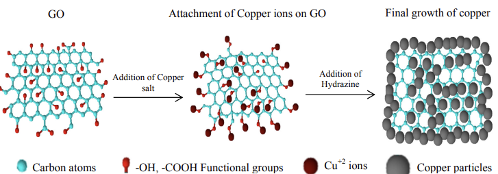 The original theme behind adaptation of this process is to take advantage of functional groups of GO for dispersion and exfoliation in water and then introducing copper ions in the solution to act as intercalation specie between graphene sheets. This will not only enhance the dispersion of graphene sheets but will also improve the interface between carbon atom and copper during feedstock preparation steps. Cu-RGO nanocomposite powder can be mixed with pure copper powder and binder system to prepare homogenously reinforced PIM feedstock. However, further characterization and optimization of process parameters is necessary to evaluate dispersion of CuRGO in PW and PIM binder system, before employing this method for PIM feedstock preparation.