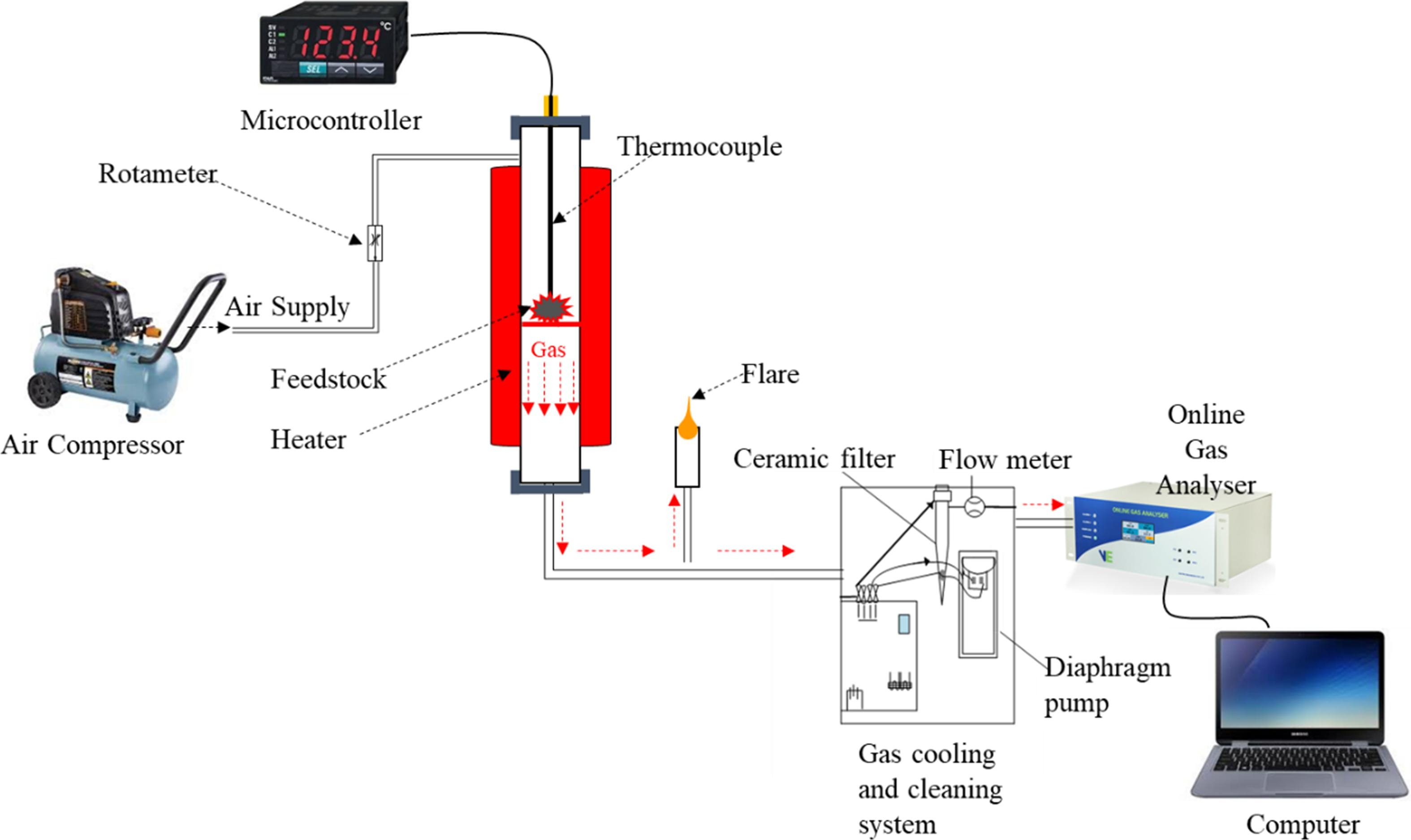 The set-up used for the study is shown in Fig. 1. It consists of a gasifier, a cylindrical metallic body encased in a ceramic electric heater. The gasifier is connected to a microcontroller from which the temperature settings are managed. An air compressor is also connected to the system for air supply, which is controlled with a rotameter. At the beginning of the experiment, the gasifier was switched on and gradually heated up by continually adjusting the temperature controller. When the desired temperature was reached, air at 2.5 L/min was supplied to the gasifier. Afterwards, the gasifier's lid was opened, and premixed biomass was poured and instantly closed swiftly. The produced gas moved through the bottom of the gasifier through a pipe and travelled through the gas cooling and cleaning unit to the online analyzer. The analyzed gas was displayed on the computer monitor connected to the analyzer via LAN intranet cable. Readings were automatically recorded every second and saved. The gasifier was switched off and cooled for charcoal and ash removal. Table 4 gives the principal measuring instruments' specifications, including their range, accuracy, and type, among others.